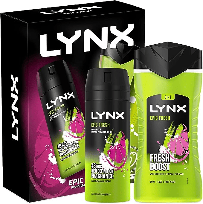Gift Set Includes: 1x Lynx Epic Fresh Bodyspray 150ml1x Lynx Epic Fresh Bodywash 225ml