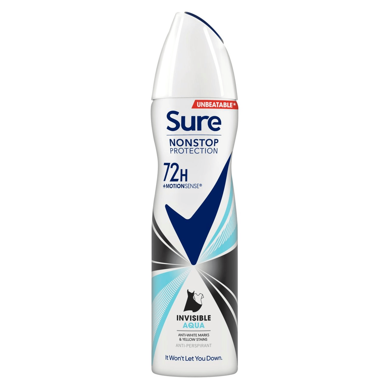 Sure Invisible Aqua Nonstop Protection Anti-perspirant Deodorant Aerosol is the first anti-perspirant that provides non-stop protection from sweat and odour for 72h whilst protecting your clothes, This anti-perspirant deodorant spray features 2x more powerful protection plus our unique MotionSense technology – the more you move, the more it protects, Sure anti-perspirant deodorant for women, from the UK’s No.1 anti-perspirant brand, gives you an all-day fresh and airy fragrance with a clean feel that activates as you move, Get all-day freshness and 72h non-stop protection from sweat and odour with this alcohol-free* anti-perspirant deodorant that is gentle enough for everyday use, The anti-perspirant can is made with infinitely recyclable aluminum and the product is assembled in a factory using 100% renewable grid electricity – let's move together for a sustainable future, Sure Invisible Aqua Nonstop Protection Anti-perspirant Deodorant Aerosol gives you protection and confidence whatever happens. Sure, it won't let you down