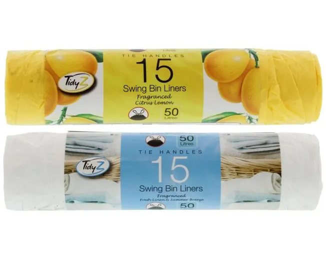 Tidyz 50L Bin Liners with Tie Handles and Fragrance come in a pack of 15 and are designed to be strong, durable, and capable of holding a variety of waste materials. Each bin liner has a capacity of 50 liters, making it ideal for larger waste items such as garden waste, household rubbish, and packaging materials.