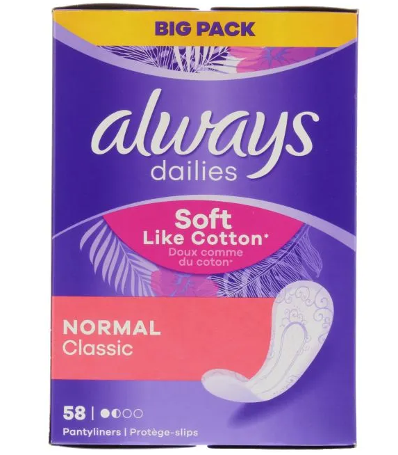 Always Dailies Panty Liners Normal 58's is a pack of 58 panty liners designed for daily use to keep you feeling fresh and clean. They are designed to fit comfortably in your underwear and provide protection against unexpected leaks or spotting.