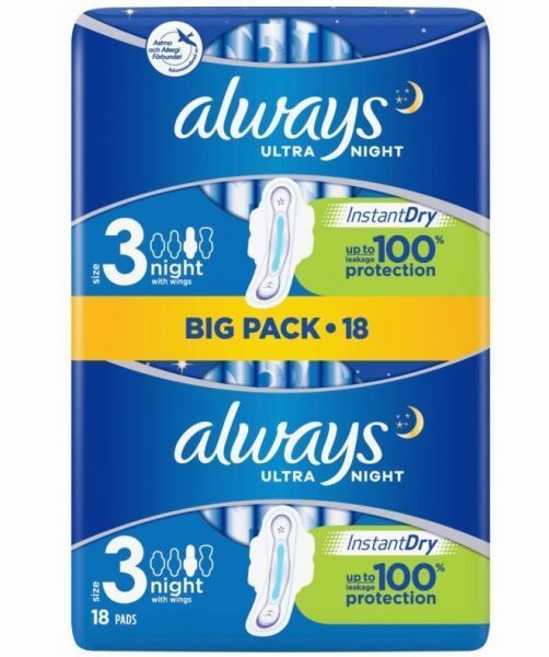 Always Ultra Night Sanitary Pads with Wings - Size 3 - Dermatologically Tested - Pack of 18