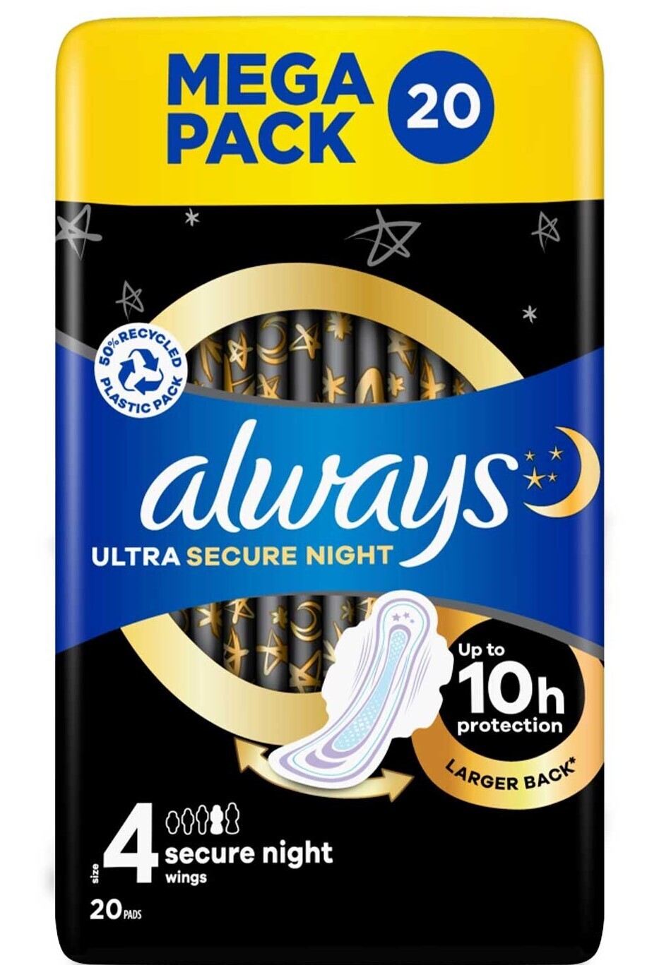 Always Ultra Secure Night Sanitary Pads with Wings - Size 4 - Dermatologically Tested - Pack of 20