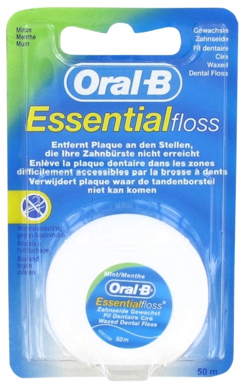 Oral-B Essential Floss Waxed Dental Floss Mint Taste 50m removes dental plaque in areas difficult to reach by the toothbrush.