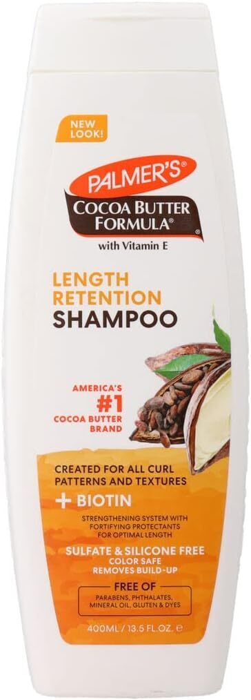 Palmers Cocoa Butter Formula Length Retention Shampoo with Biotin, fully strengthens hair with powerhouse natural protectants that help block brittleness, breakage and split ends to support optimal length.