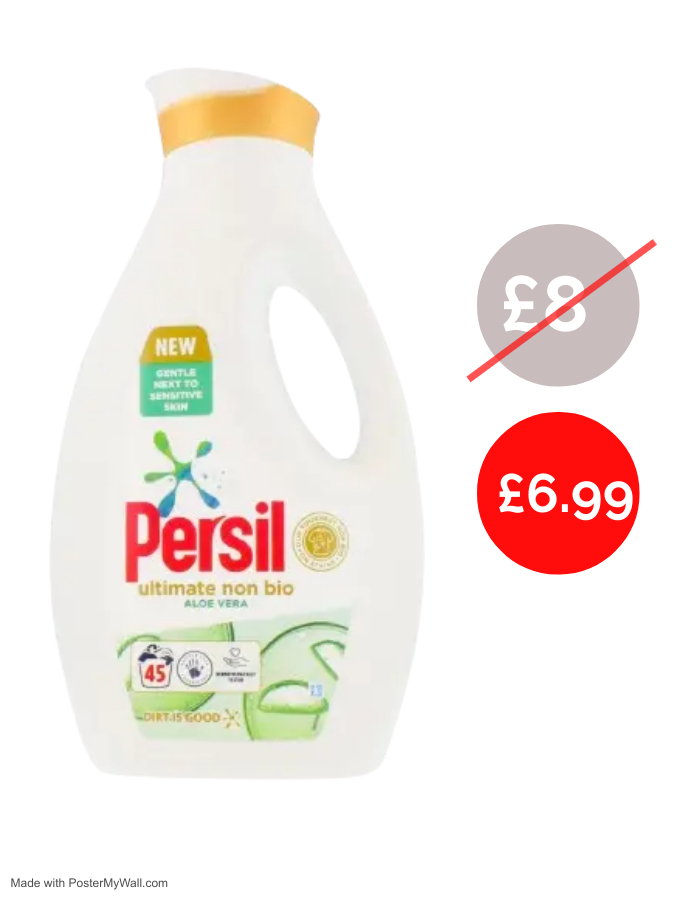 Persil Ultimate Non Bio Aloe Vera Liquid Detergent 45 Wash is Persil’s toughest Non Bio Liquid on stains, Persil Ultimate Non Bio Aloe Vera has been boosted with extra stain removers to tackle tough stains, from pasta and chocolate sauce to iced coffee and mud, Persil Ultimate Non Bio Aloe Vera washing liquid is dermatologically tested, so you can be reassured that our laundry detergent is gentle next to sensitive skin, Infused with gentle and soothing notes of Aloe Vera, Persil Ultimate Non Bio Aloe Vera will leave your clothes and bedding with a delicate, fresh fragrance that lasts, Persil's research into skin care is recognised by the British Skin Foundation, Our laundry detergent bottles are 100% recyclable and contain recycled plastic.
