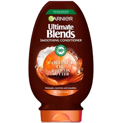 Garnier Ultimate Blends The Sleek Restorer Coconut Oil & Cocoa Butter is a hair care product that is specifically designed to provide deep nourishment and hydration to dry, frizzy, and unruly hair. This conditioner is enriched with natural ingredients like coconut oil and cocoa butter, which are known for their rich concentration of fatty acids and antioxidants that help to nourish and repair the hair from within.