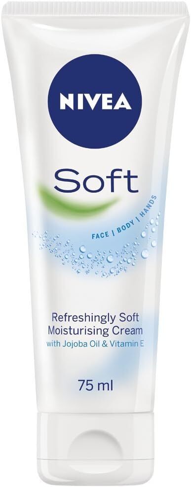 Nivea Soft Moisturising Cream 75ml provides refreshing and light hydration with Jojoba Oil and Vitamin E. Its non-greasy texture is perfect for use on face, hands, and body.