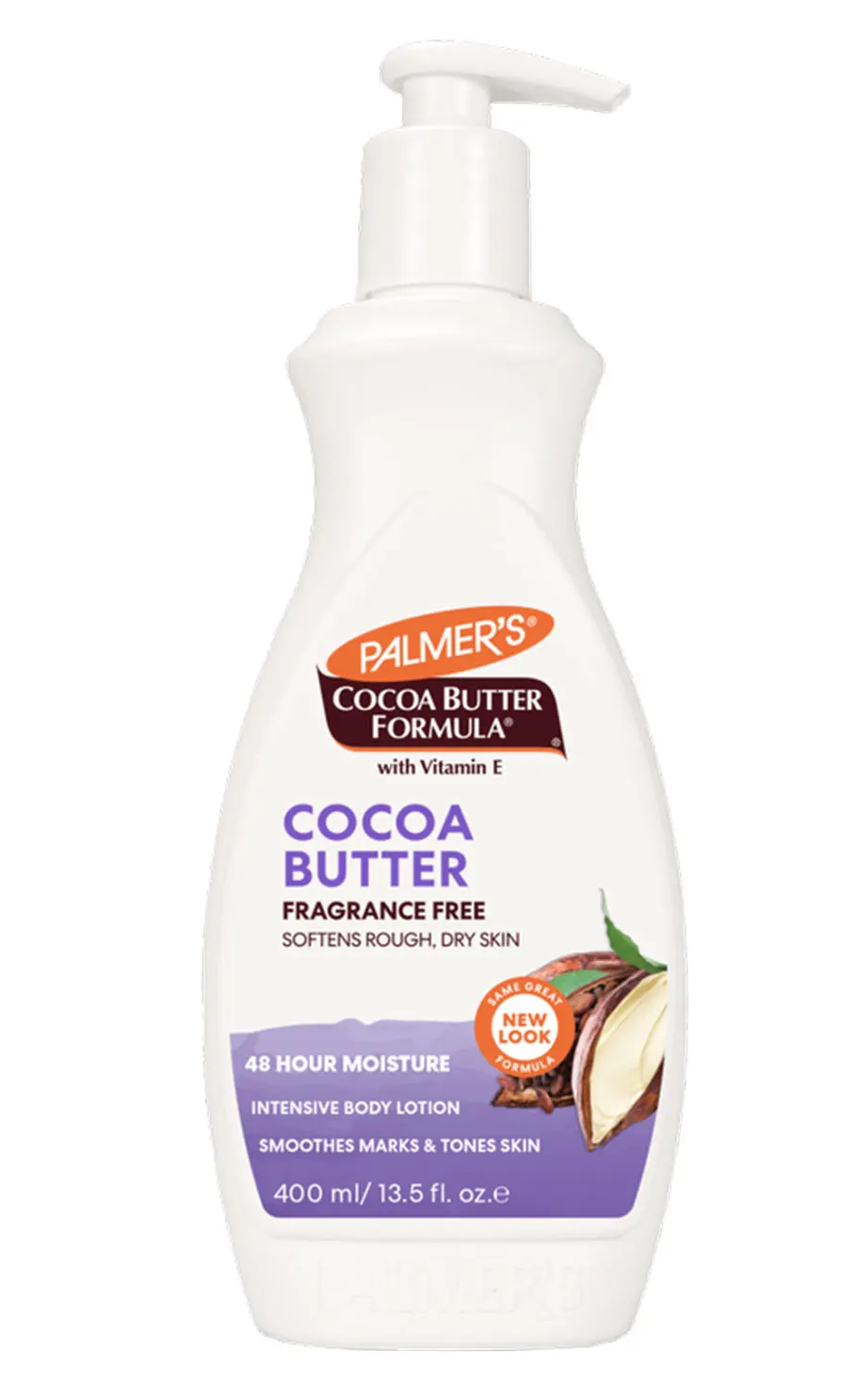 Palmers Cocoa Butter Formula Fragrance-Free Lotion 400ml offers the same intense hydration and skin-loving benefits of the 250ml version in a larger, more economical format. It features a fragrance-free, hypoallergenic formula that’s perfect for sensitive, allergy-prone, or irritated skin. Enriched with Cocoa Butter and Vitamin E, this non-greasy lotion absorbs quickly to nourish dry areas and improve elasticity and tone.