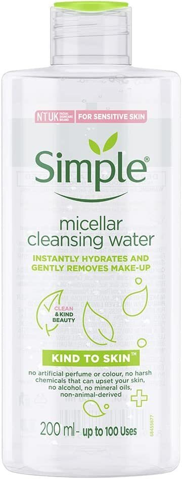 Simple Kind to Skin Micellar Cleansing Water 200ml is a gentle, no-rinse daily cleanser that effectively removes dirt, makeup, and environmental pollutants while deeply hydrating the skin. Thanks to its skin-loving ingredients including Vitamin B3, Vitamin C, and Pro-Vitamin B5, it supports skin health while maintaining its natural barrier. Its micellar technology lifts away impurities without irritation, making it ideal for even the most sensitive skin types. With no alcohol, no perfume, and no dyes, it refreshes, soothes, and leaves the skin soft, clean, and glowing after every use.
